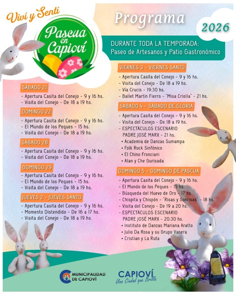 La funcionaria afirmó que «ya hace un par de semanas que Capioví está totalmente decorado de Pascuas, con conejos gigantes en las plazas, conejos en hamacas y demás», y agregó, «pero este fin de semana comenzamos con otras actividades adicionales, como por ejemplo la visita del Conejo a la Casita del Conejo, que también comienza a abrir a partir de este sábado de 9 a 12 y de 16 a 19, con una decoración temática como para que la gente se acerque y pueda ver todo lo que tenga que ver con la Pascua».