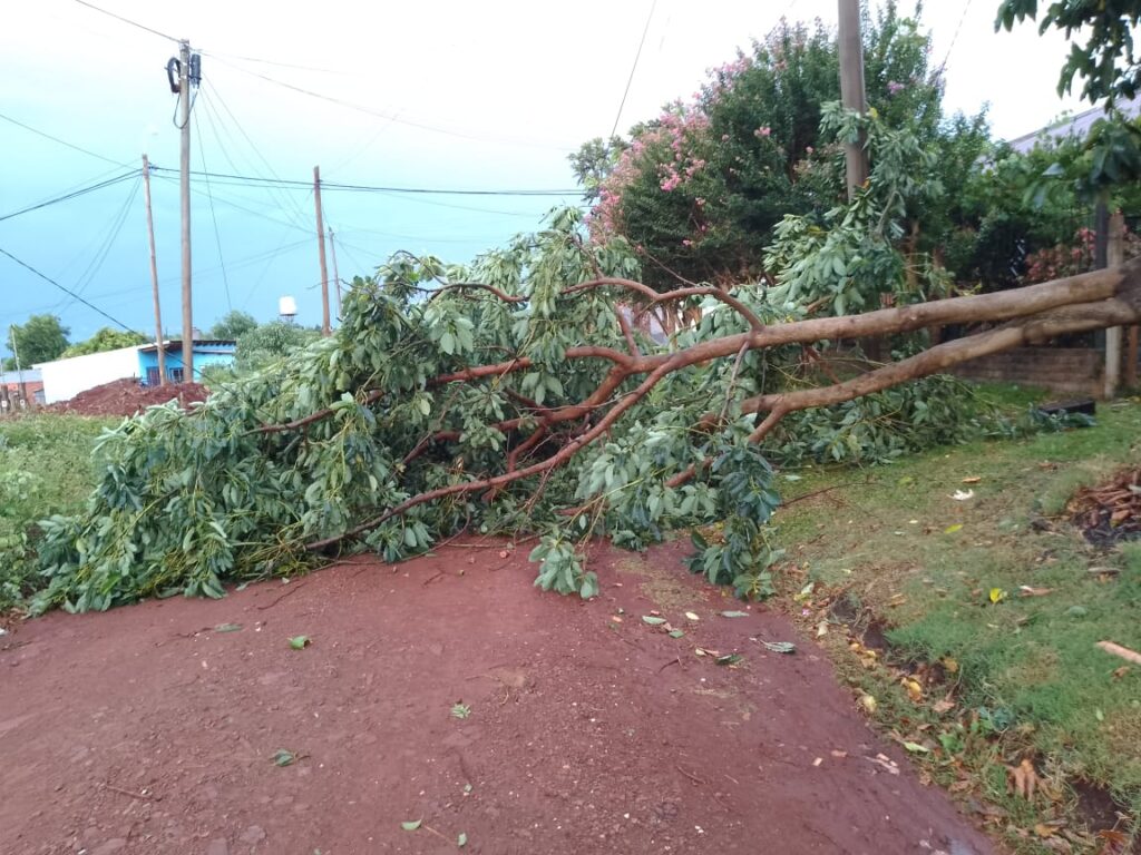 La tormenta con fuertes lluvias y ráfagas intensas de viento afectó distintos sectores de la ciudad de Oberá, provocando la caída de árboles, desprendimiento de ramas de gran porte y obstrucción de la vía pública, así como también voladuras de techos en viviendas de la comunidad.