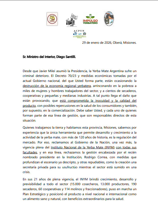 En otro punto de la entrevista, Sand adelantó que una carta firmada por la Asociación de Productores Agropecuarios de Misiones (APAM), Salvador Torres del Movimiento Agrario de Misiones (MAM), Julio Petterson por la Asociación Civil de Productores Yerbateros del Norte (ACPYN), Jorge Lizznienz (Productor de Jardín América), Antonio França de la Asociación Productores Yerbateros y Tareferos del Alto Uruguay, y Jorge Skripczuk por la Asociación Civil Impulso Yerbatero, será enviada al ministro del Interior de la Nación, Diego Santilli, a través de la Federación de Cooperativas (FeDeCoop), en una reunión en la que participará junto a la Confederación Intercooperativa Agropecuaria (Coninagro).