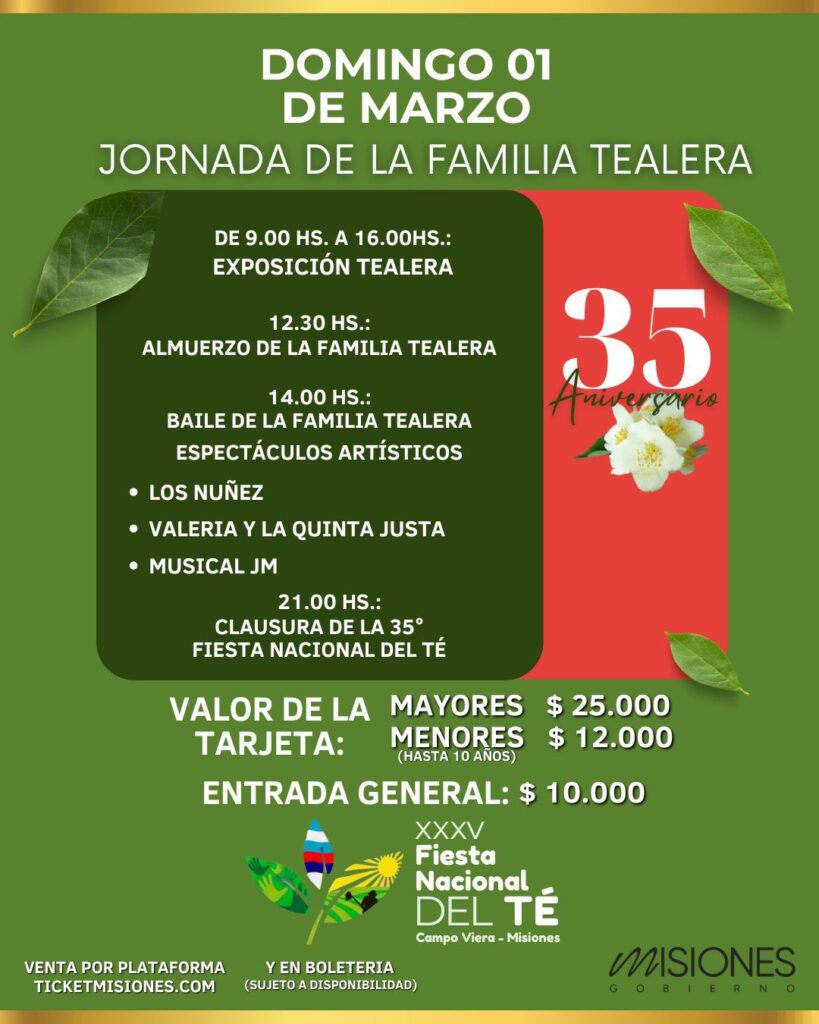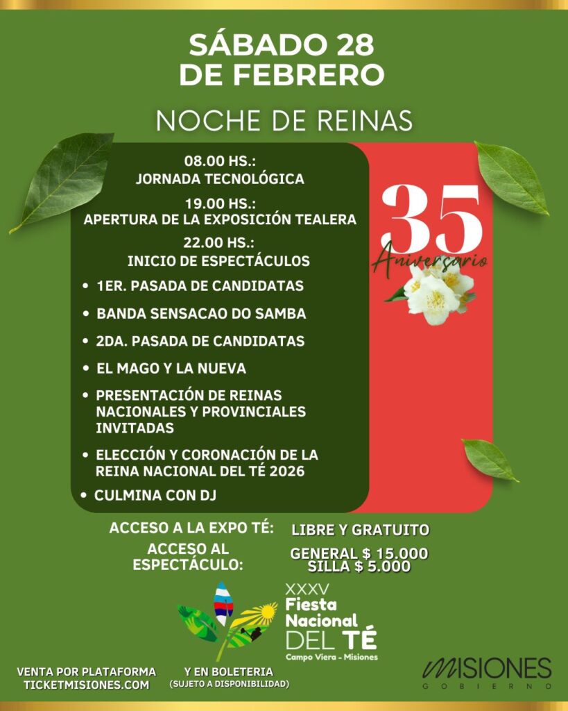El sábado 28 se realizarán las jornadas tecnológicas durante todo el día. Por la noche, se realizará la elección de la nueva soberana del Té. En lo artístico, se presentan Banda Sensasao Do Samba, El Mago y la Nueva, y un gran cierre con DJ. El costo de la entrada será de 16.500 pesos.