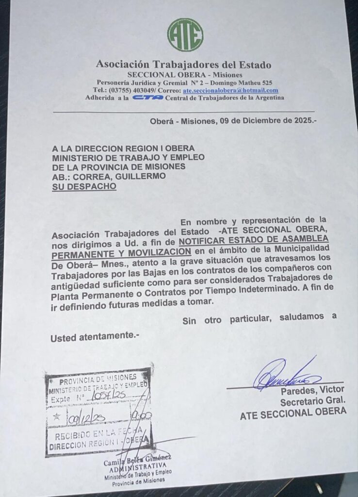A través de una nota entrega en el Ministerio de Trabajo, la Asociación de Trabajadores del Estado (ATE) confirmó que se encuentra en Estado de Alerta y Movilización por la no renovación de contratos de trabajadores de la Municipalidad de Oberá con antiguedad para ser Planta Permanente.