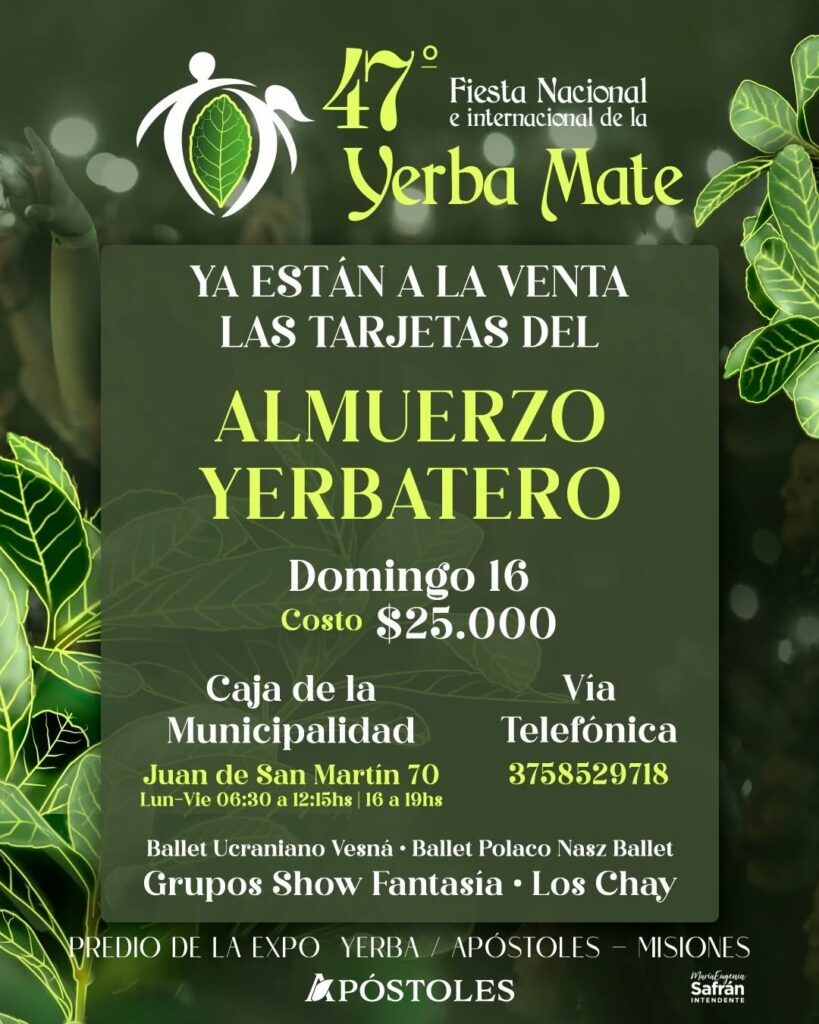 “Estamos muy contentos con esta nueva edición, que se concreta con mucho esfuerzo para mantener la entrada libre y gratuita a la exposición. Lo hacemos con la convicción de que todos puedan participar, disfrutar y acompañar a nuestros expositores, fortaleciendo a la economía local y al sector yerbatero y generando un espacio de encuentro y disfrute para toda las familias”, afirmó.